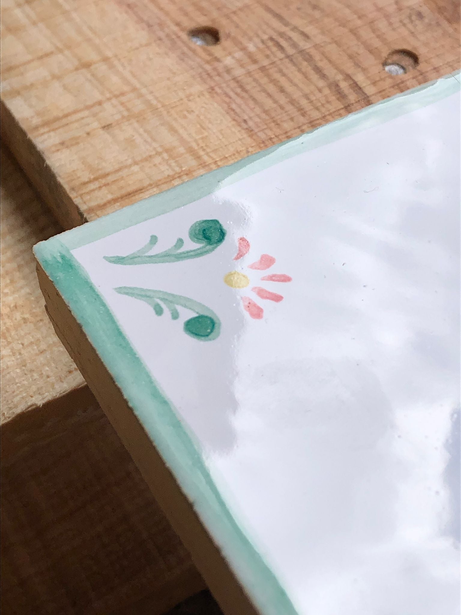 Tabla de cerámica pintada cuidadosamente a mano , de diferentes colores y con el mango de madera de pino.