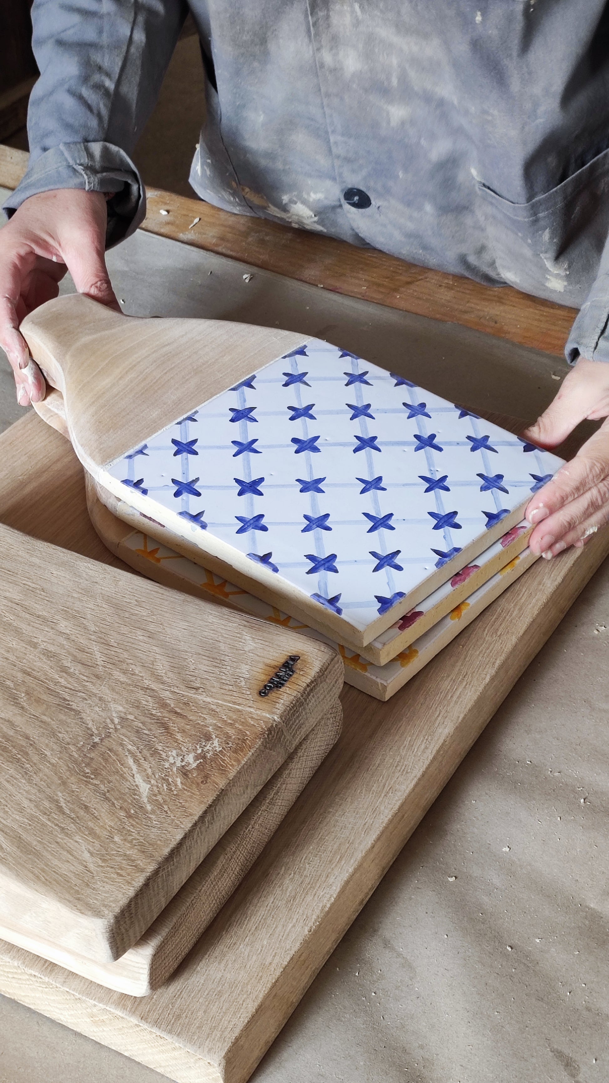 3 Tablas Mallorca de color azul mediterráneo, rosa palo y ocre.