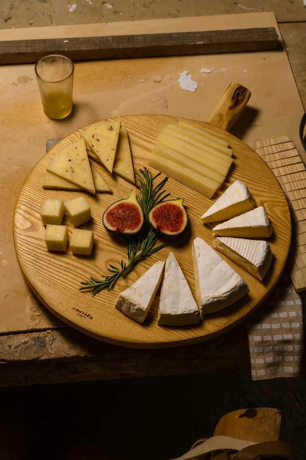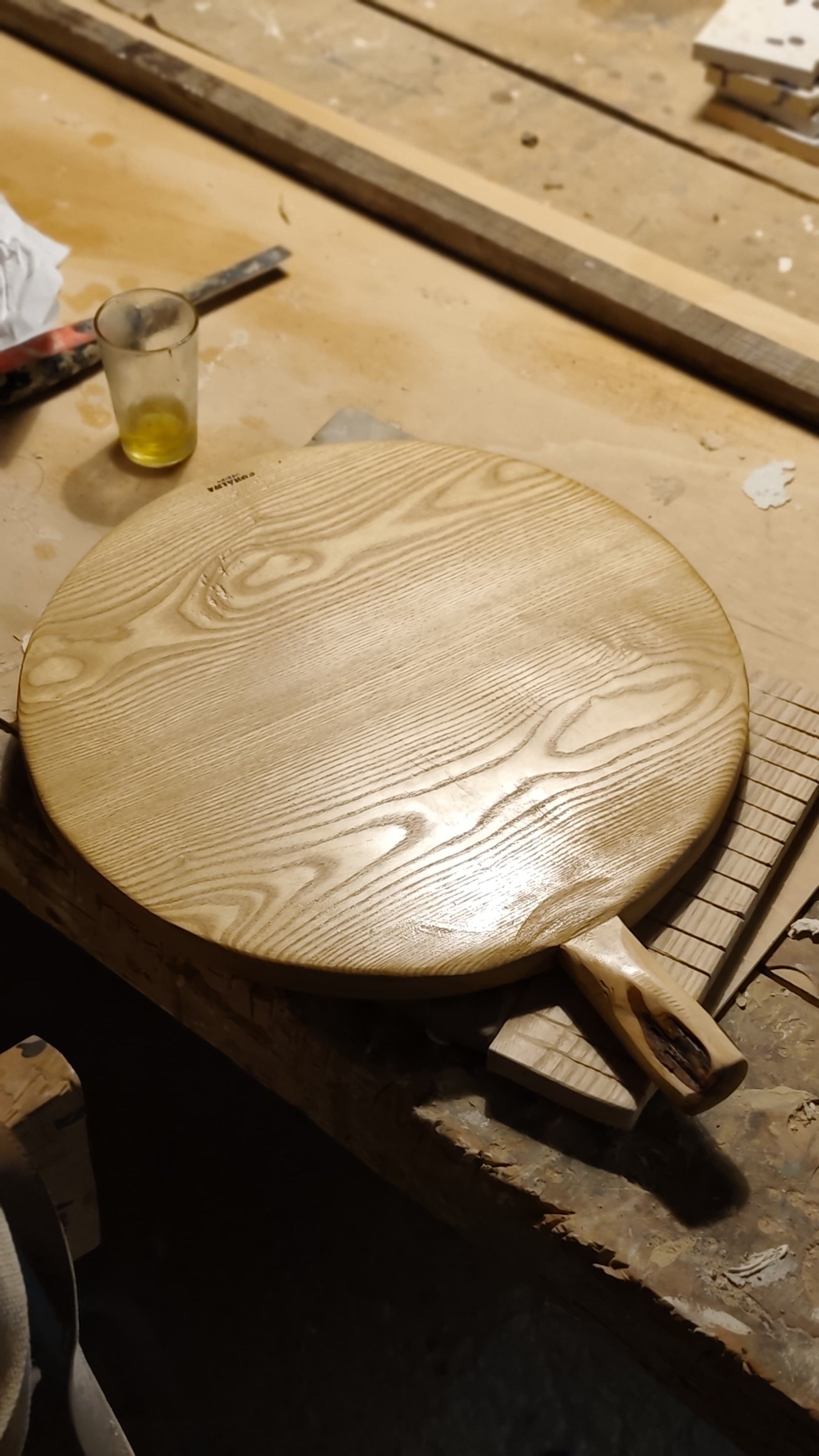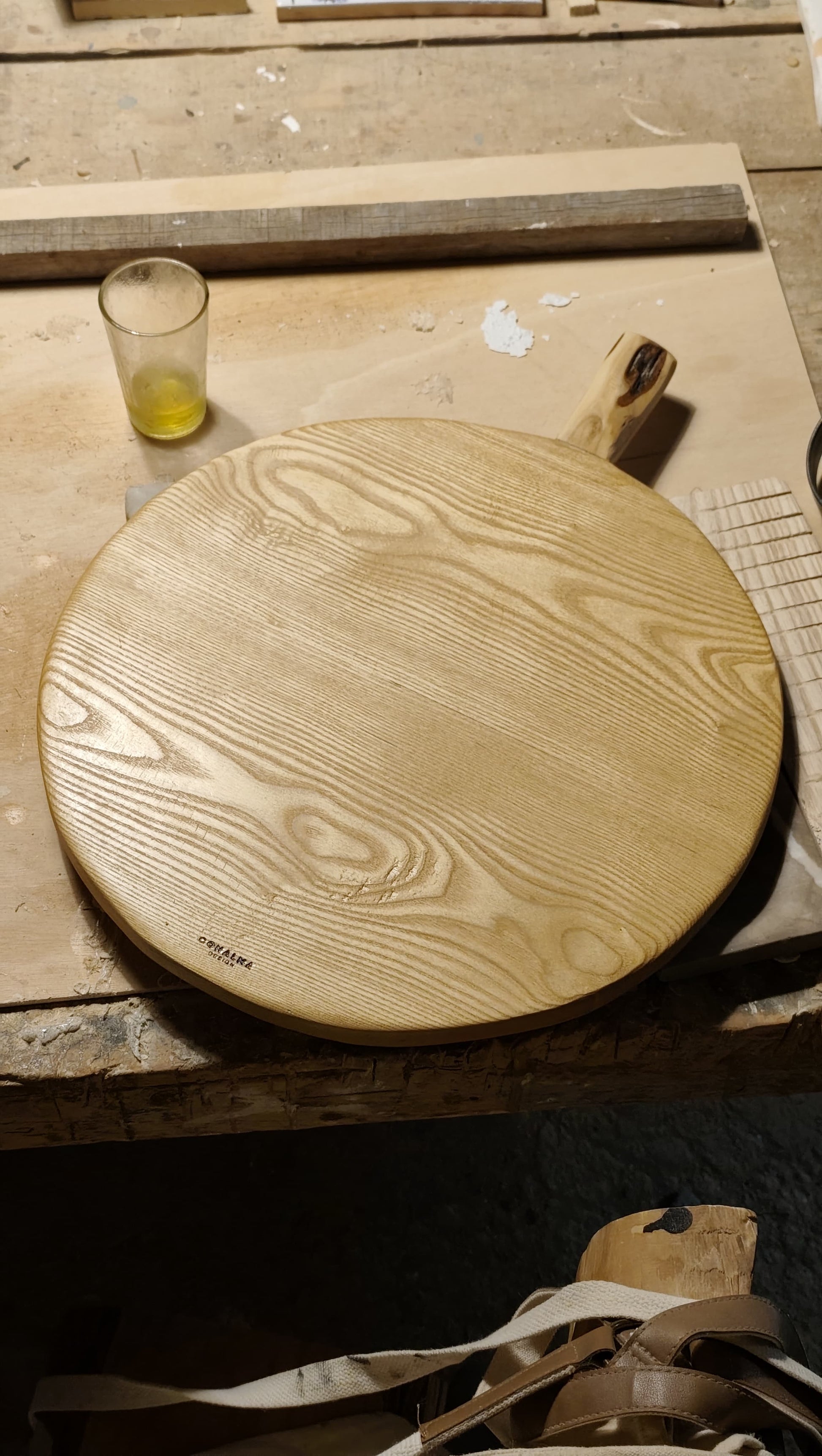 Tabla circular de madera de fresno con mango de olivo.